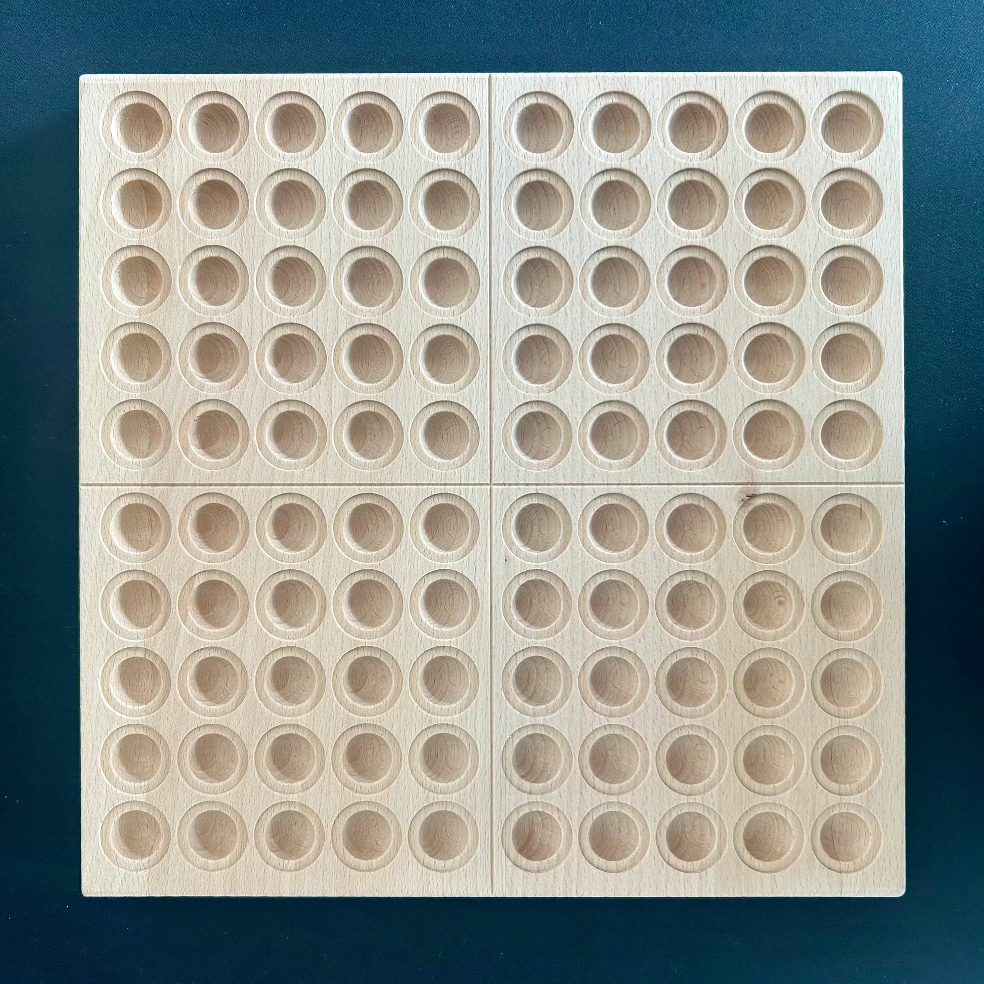Enhance your child's learning experience with our Montessori Wooden Hundred Board! Designed for children aged 3 and up, this beautifully crafted board is an essential tool for teaching everything from numbers, counting, patterns, graphing, spelling, coding, and more. Made from high-quality, solid beechwood, it features 100 round divots with an additional recessed ring designed to hold any of our mini 1" disc sets.