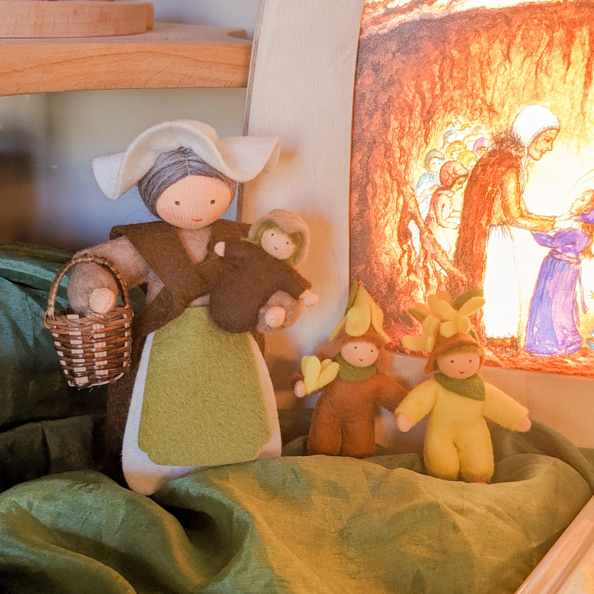 Ambrosius Mother Earth with Baby Seed | set of one standing and one wrapped miniature felt dolls