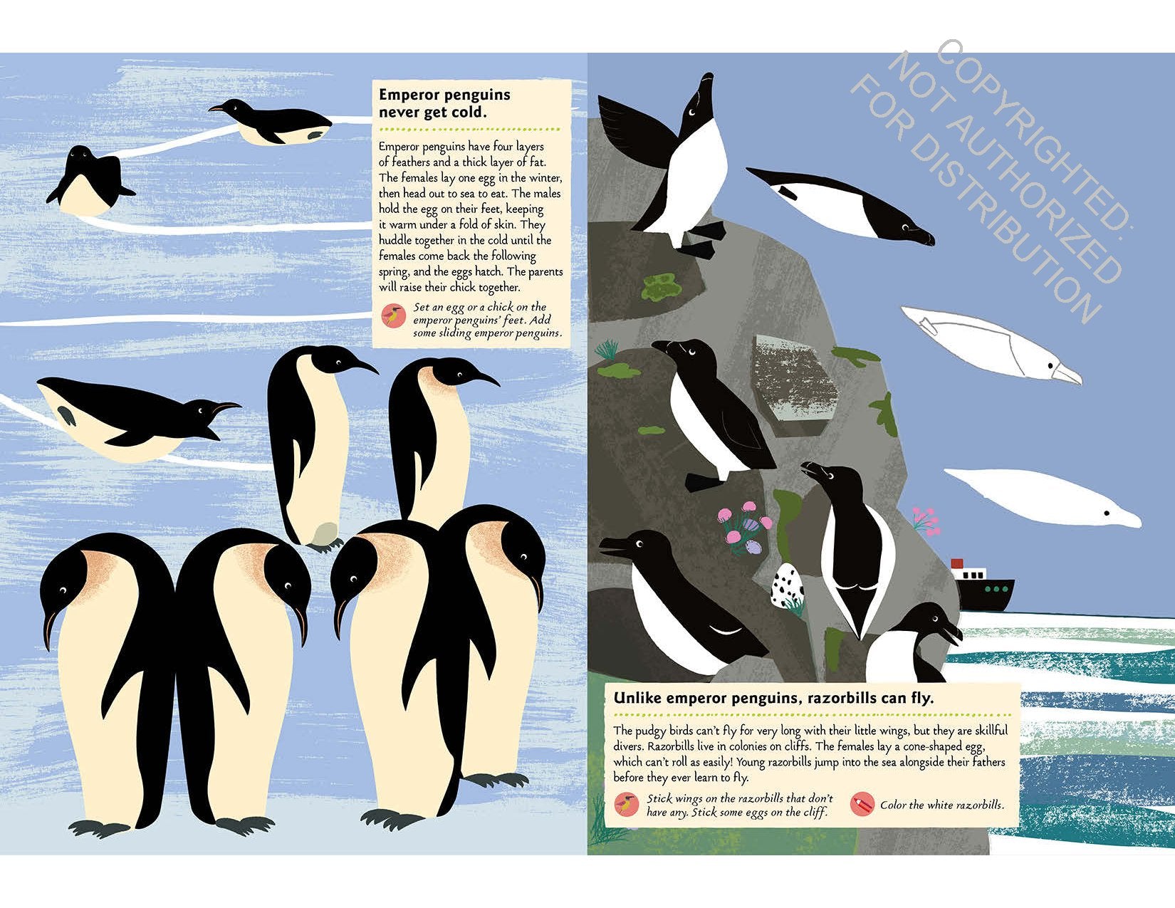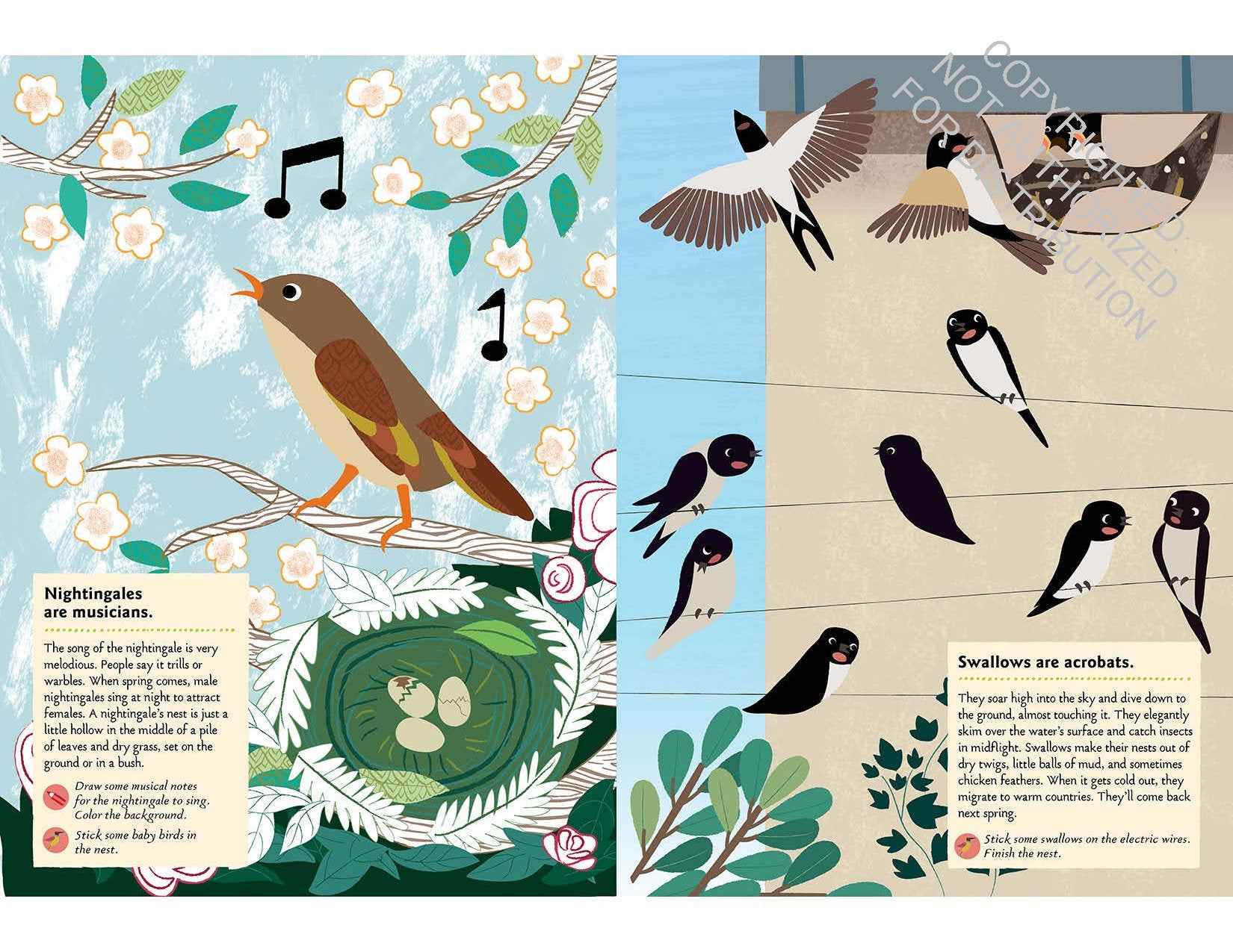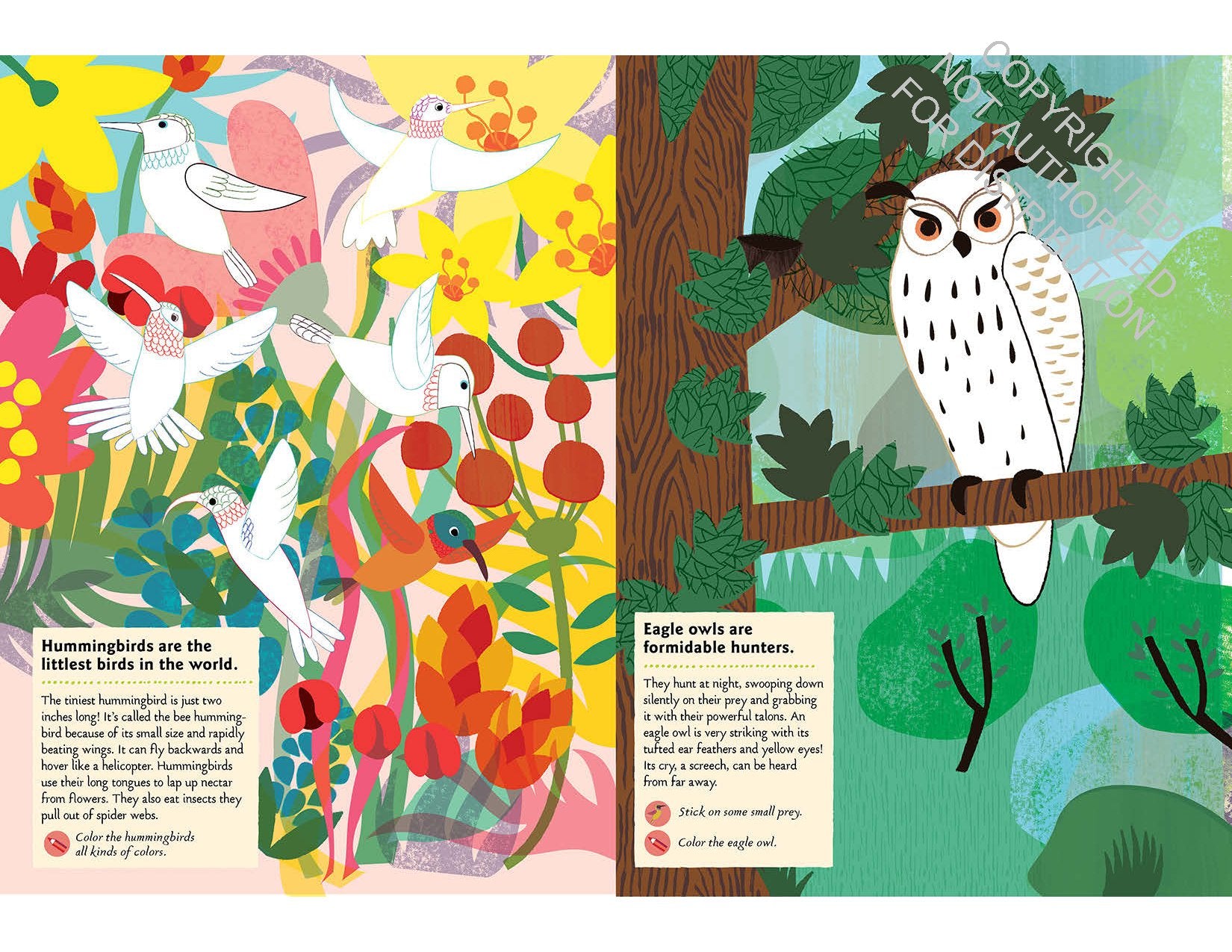 Beautifully illustrated by Olivia Cosneau, Birds of the World introduces aspiring ornithologists to these and other fun facts through a range of coloring activities, removable stickers, and a short quiz. In the process, children learn about the rich variety of birds living in our world, including nightingales, swallows, hummingbirds, pelicans, penguins, parrots, toucans, and flamingos, among others.