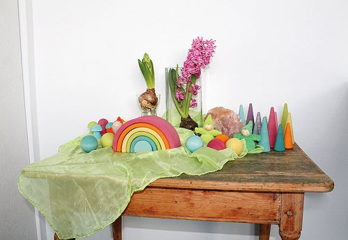 This Rainbow tunnel is really versatile and ideal already for small children! Toddlers stack, sort and build and as the children get older they will use it as a cradle for dolls, as fence for animals, like a tunnel or bridge for vehicles, as house for dwarfs and dollhouse dolls, build amazing sculptures... this rainbow will always be integrated in playing with a lot of fantasy. Perfect to combine with wooden balls pastel colors (Art. No 10238).