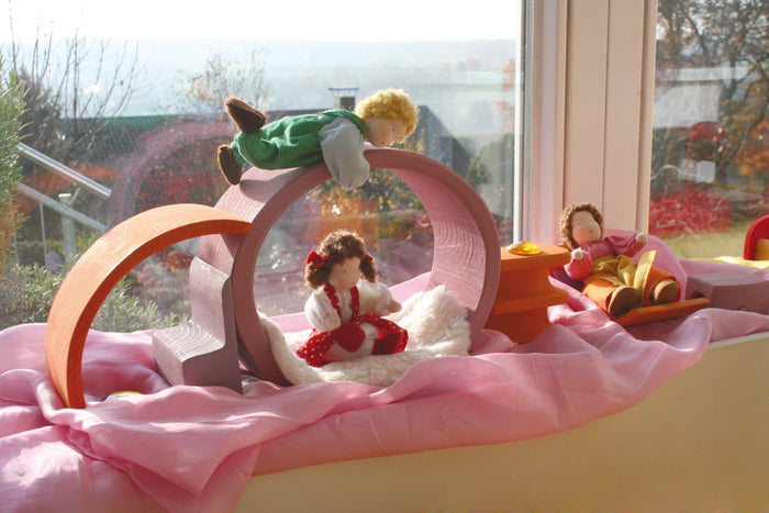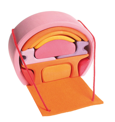 Grimms small Pink Mobile Home contains: roof, 3 arcs (bed, cradle, wall…), 2 felt pieces, cooker, 2 chairs, table and a shelf. The 14 pieces are held together by an orange felt cover and the mobile home is easily transportable with two cotton cords. The children can carry it to their friends, the restaurant or in summer in a park for playing.