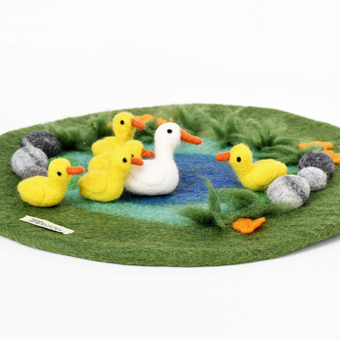 Inspired by the nursery rhyme "5 Little Ducks", this duck pond play mat consists of Mother Duck and 5 little yellow ducklings. Duck pond play mat is decorated with felt stones, yellow flowers and beautiful felt grass handmade from merino wool. The ducks have been meticulously needle-felted and can be moved around the playscape.