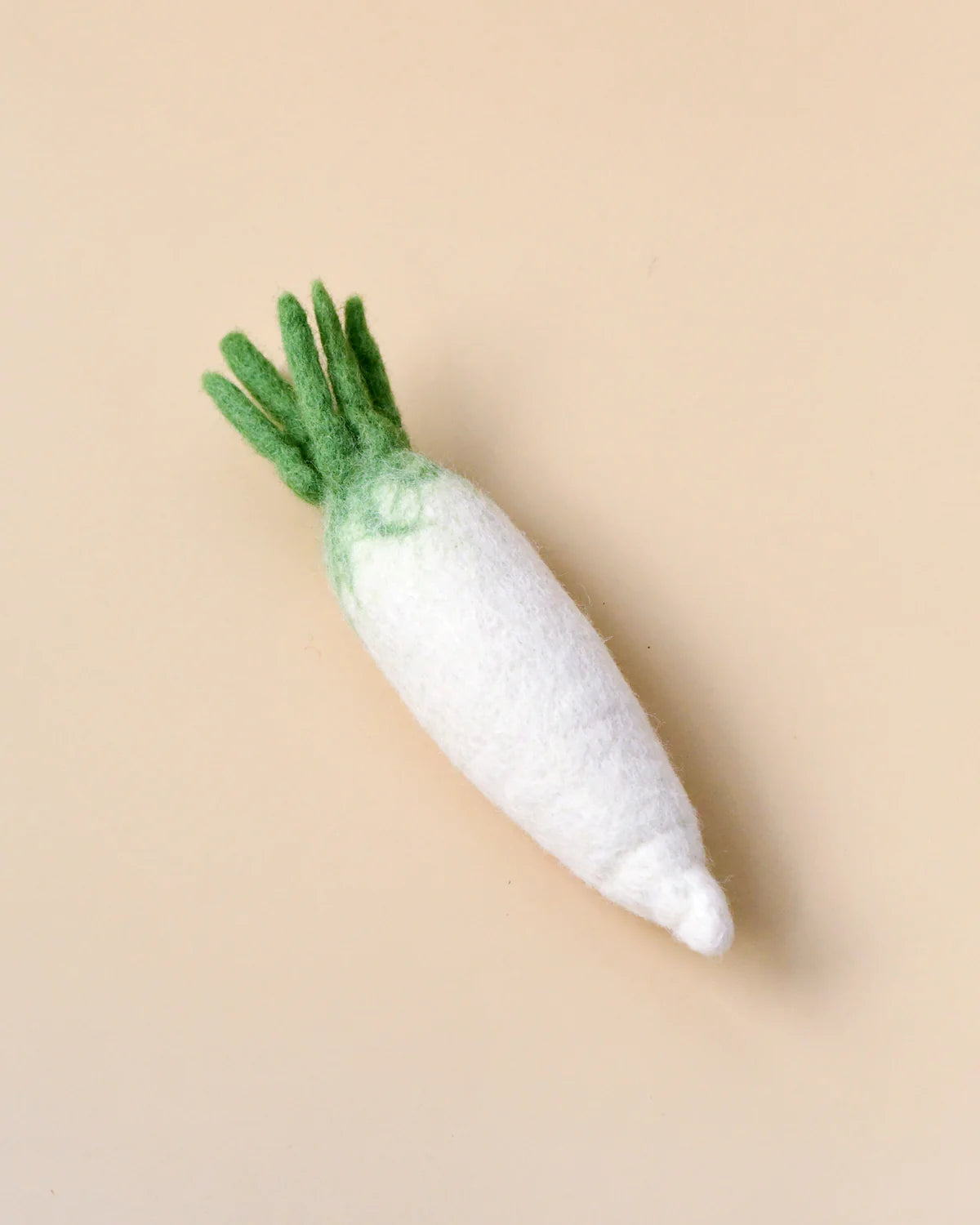 Introducing our Felt Daikon Radish (White Carrot) Play Food, a unique and fun addition to your child's play kitchen. With its crisp white body and vibrant green top, this felt daikon radish brings the vibrant flavours of traditional Asian dishes to life in a playful, hands-on way.