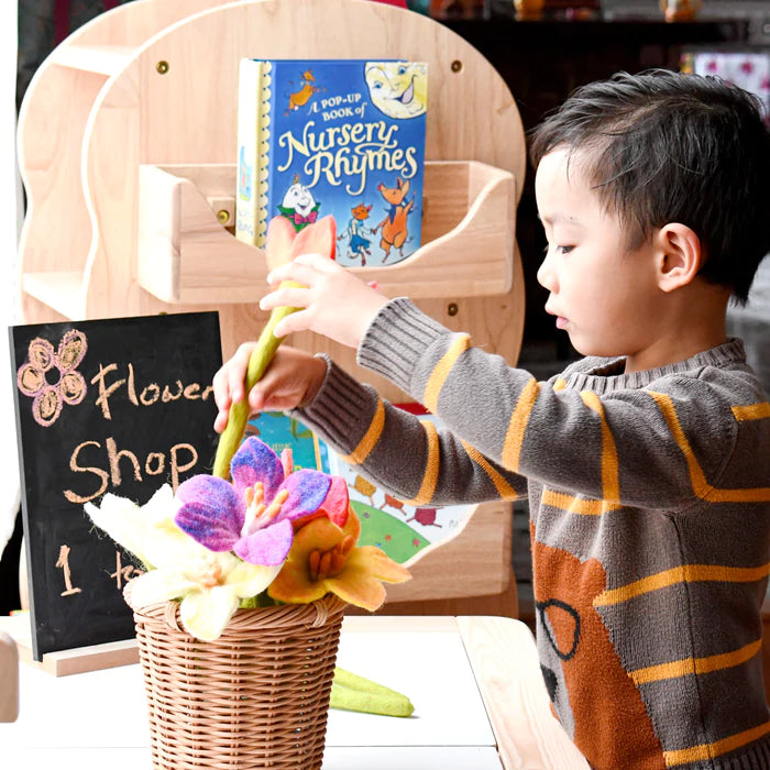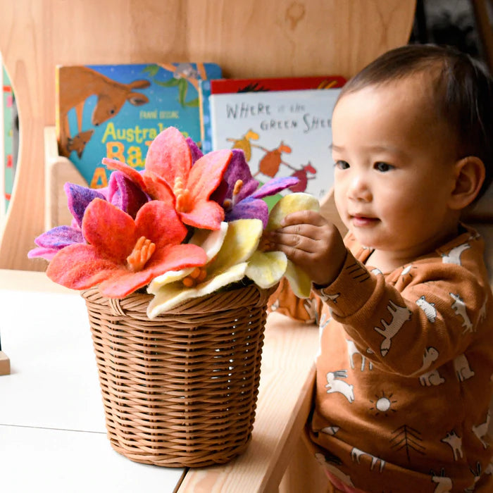 This set of 5 felt flowers is made from natural NZ wool felt, enhancing its tactile properties. Our felt flowers will come to you wrapped in tissue paper, and you can choose to place them in a container so that it also contributes to the play schema.