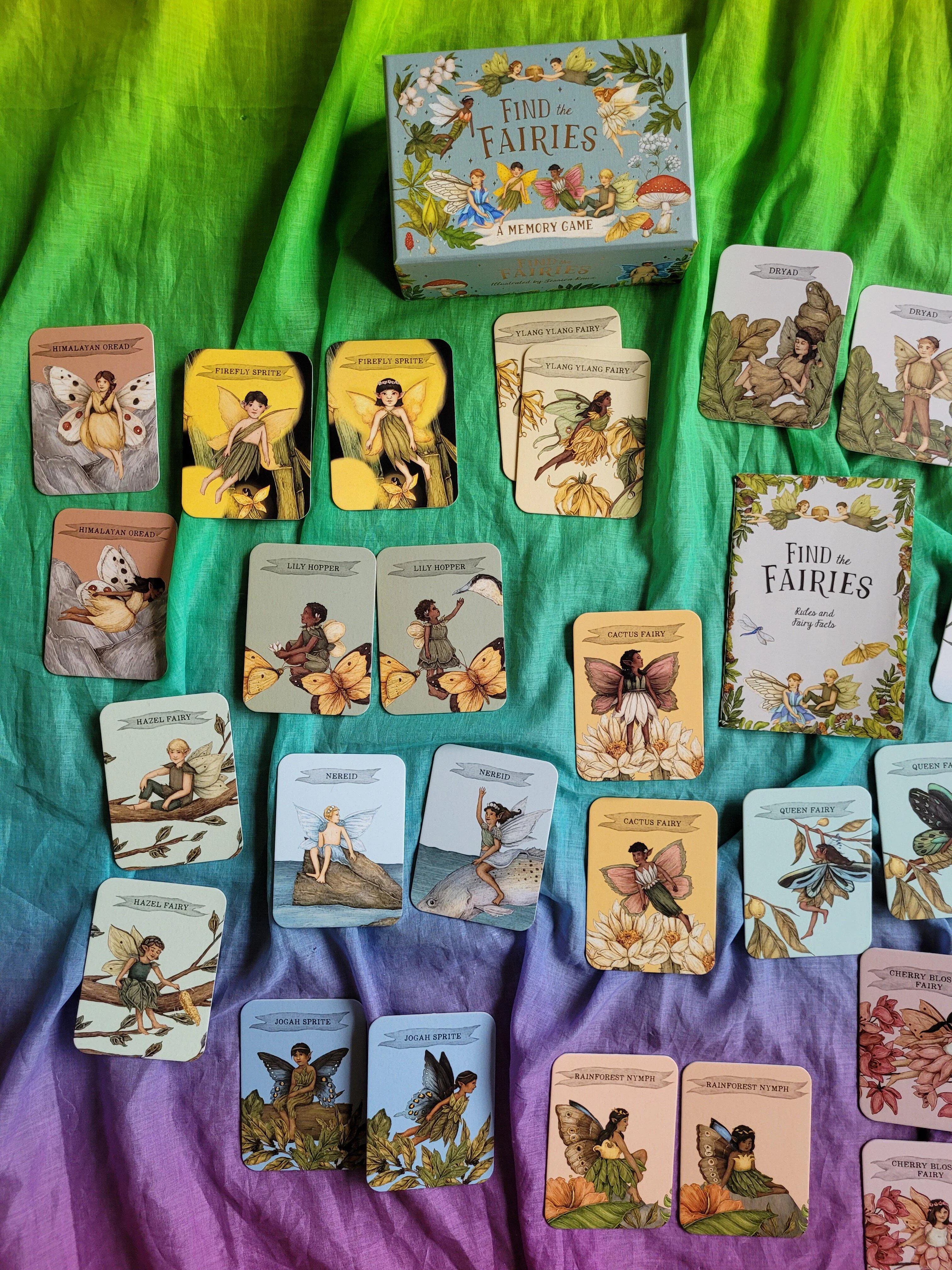 To play the game, arrange the cards face down on a table, then flip two over – do they show the same fairy species? If they do, you collect the pair. If not, try to remember where the different fairy species are located so you can make a match on your next turn.
