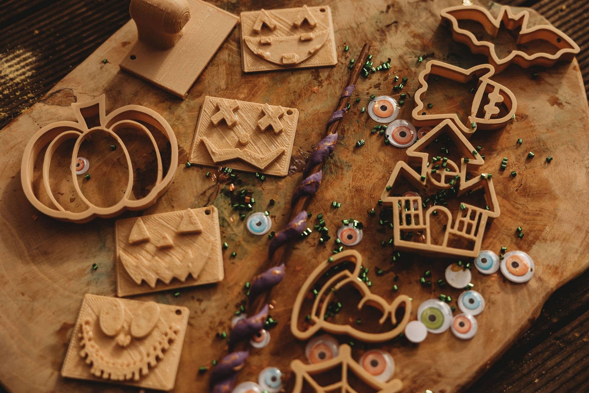 Includes: 4 x Halloween Face Tiles, 1 x Pumpkin Eco Cutter, 1 x Eco Stamp Handle