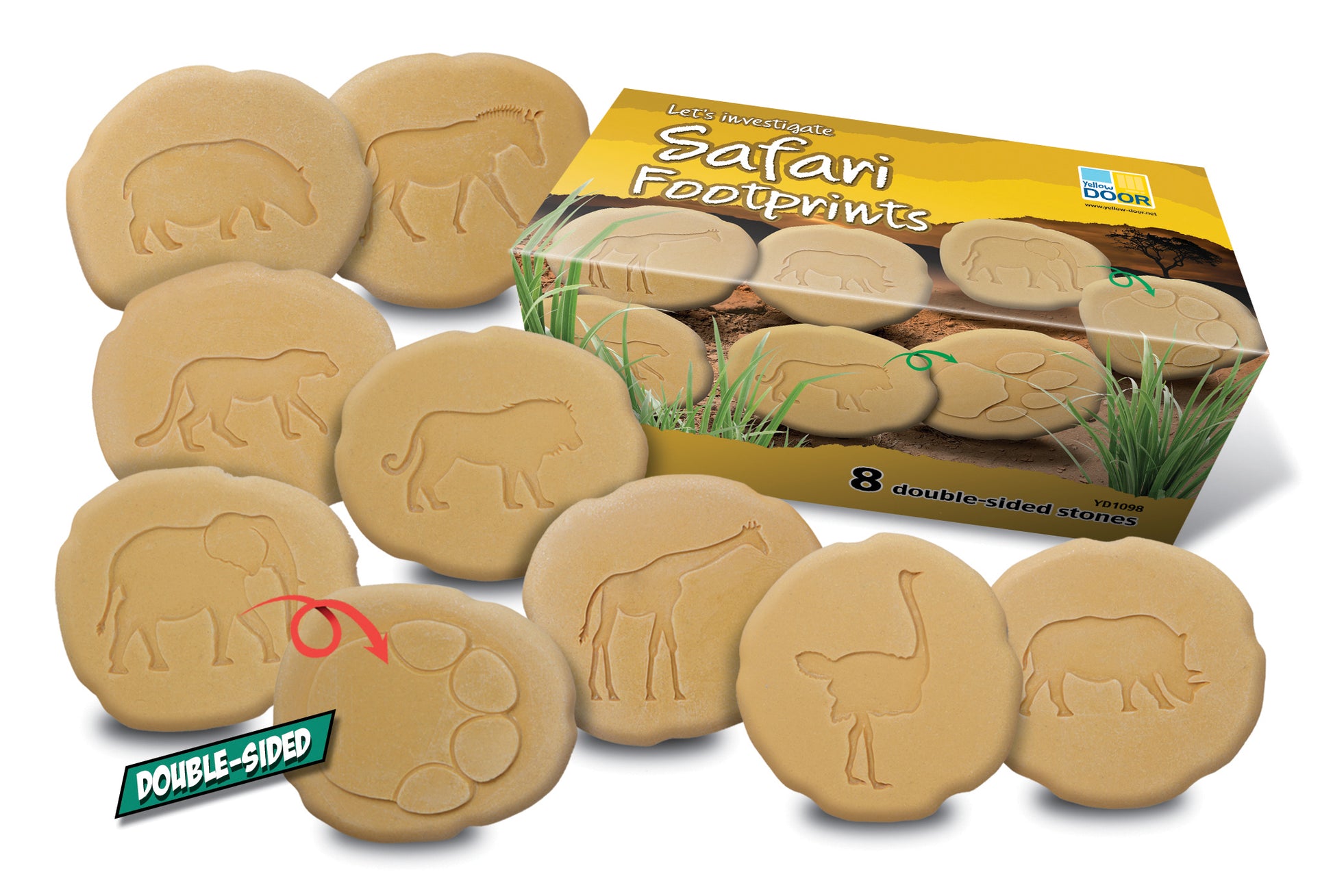 Take a walk on the wild side and explore what animals you might find on the African savannah as you follow their tracks. Each stone has a raised footprint on one side and the related creature indented on the other. Watch out for the following animals: lion, elephant, rhinoceros, giraffe, hippopotamus, ostrich, cheetah and zebra. Made from a durable stone mix, the footprints can be used in sand, water and soil, and are easily washed clean for a new adventure. Contains eight double-sided stones measuring approx 3″. Safe for age 2+.