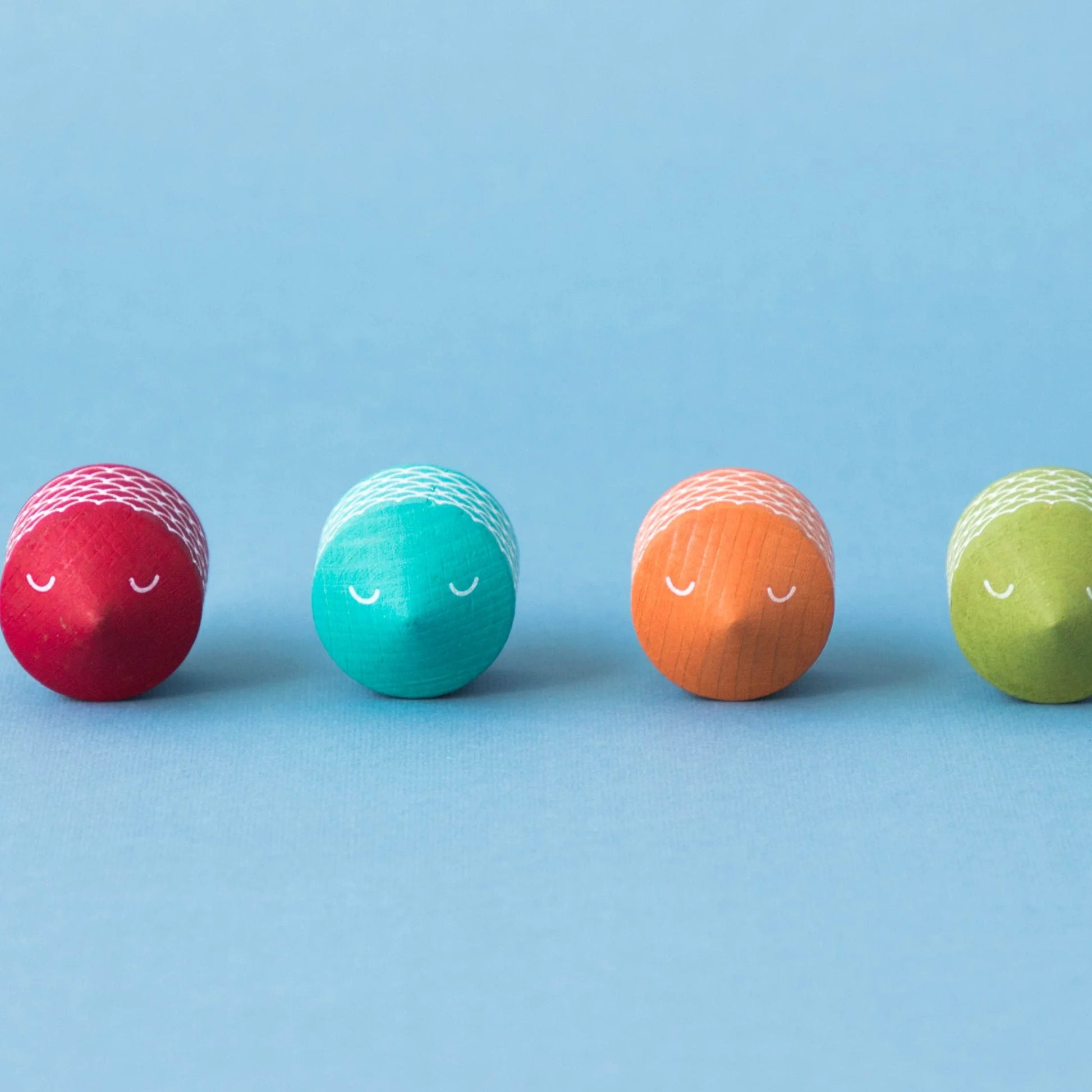Coloured beechwood spinning top made of solid wood,...and vegetable-based stains. Each top measures approx. 6 x 5 cm.