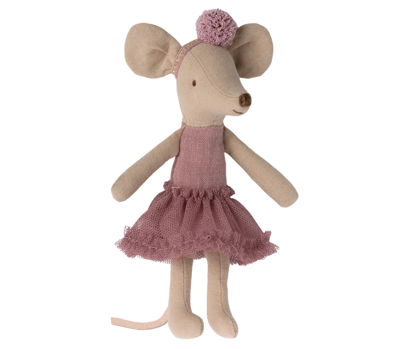 A big sister mouse dressed up like a graceful ballerina. She wears a beautiful heather colored tutu and a beautiful headband - ready for hours of dance.