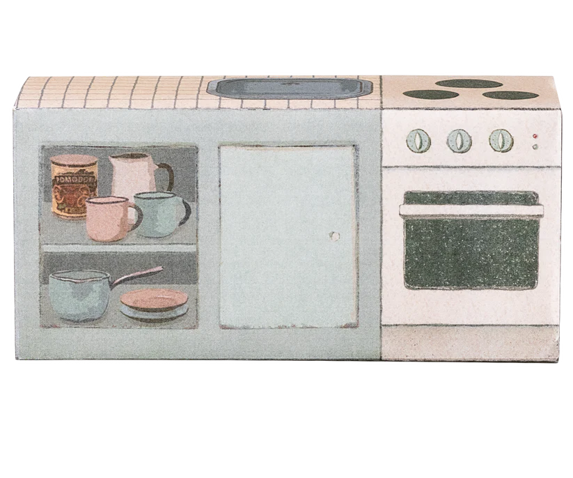 The small kitchen counter comes with 2 cups and 2 plates, a pot and a pitcher and a small can. The small sink is made of metal to look as real as possible. It fits perfectly into the kitchen in the SuitCasa mouse house.