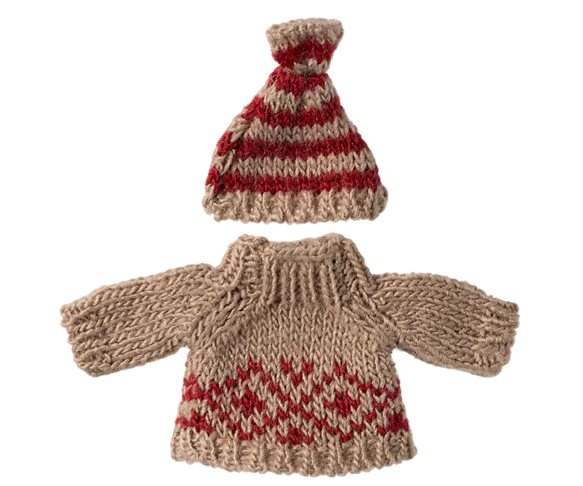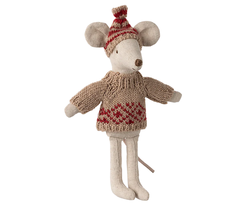 A soft knitted sweater for the cold wintertime. It has a beautiful pattern inspired by the old traditions of knit in Scandinavia. The tiny hat will keep the ears warm as well. This sweater fits mice in size mum/dad and grandma/grandpa perfectly.