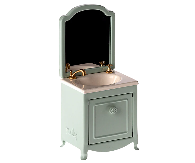 A beautiful item for the royal bathroom in the Maileg mouse castle. It has a small closet under the sink and of course a mirror as well. The mirror is removable for extra decorating options!