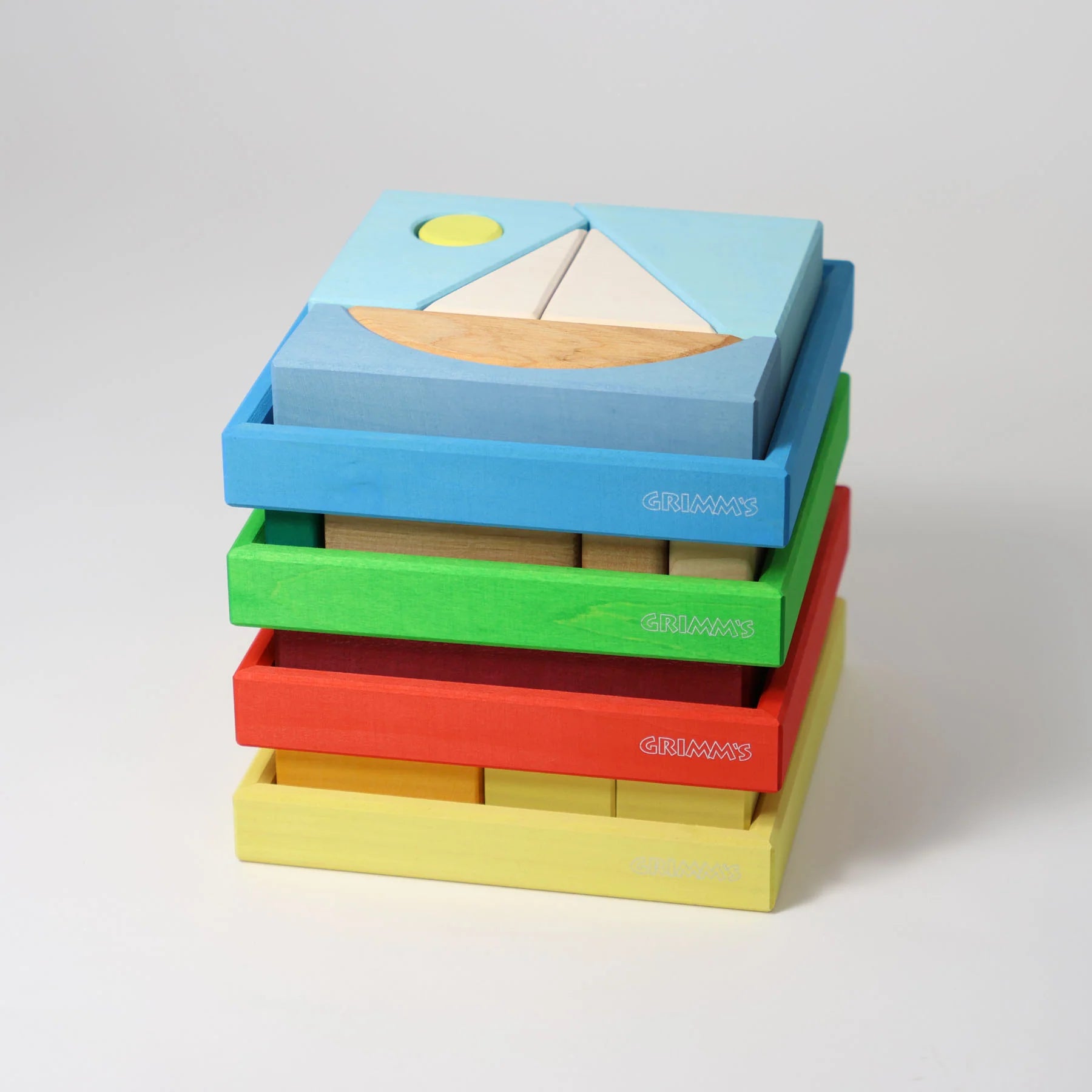 Yellow like ... summer. Symbols full of vibrancy meet warm yellow tones full of positive energy. Outside the frame, the organic building blocks become artistic and summery flower meadows. Building Set Yellow is part of our four Colour Building Sets. With their large pieces, they are made for the smallest hands. The colour variations provide an initial introduction to the primary and secondary colours and their different effects. Wood: Lime wood colour glazed, alder wood oiled Frame: 18.6 x 18.6 cm Building blocks: 4 cm thick