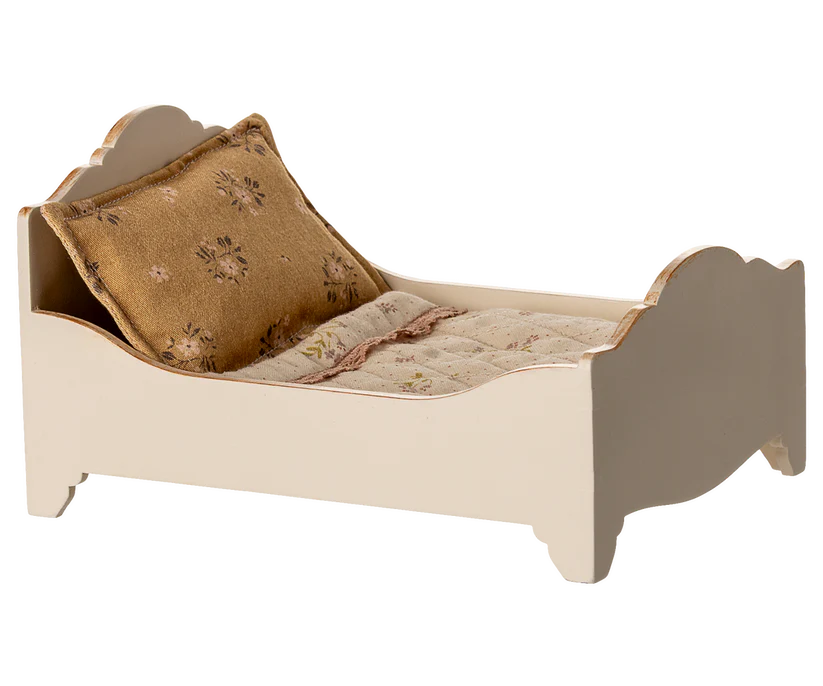 The perfect bed for a good nights sleep. This bed has beautiful small details such as golden finish on the wood and beautiful collected fabrics for bedlinen. Two mice can easily sleep side by side as it fits big sister/brother mice.