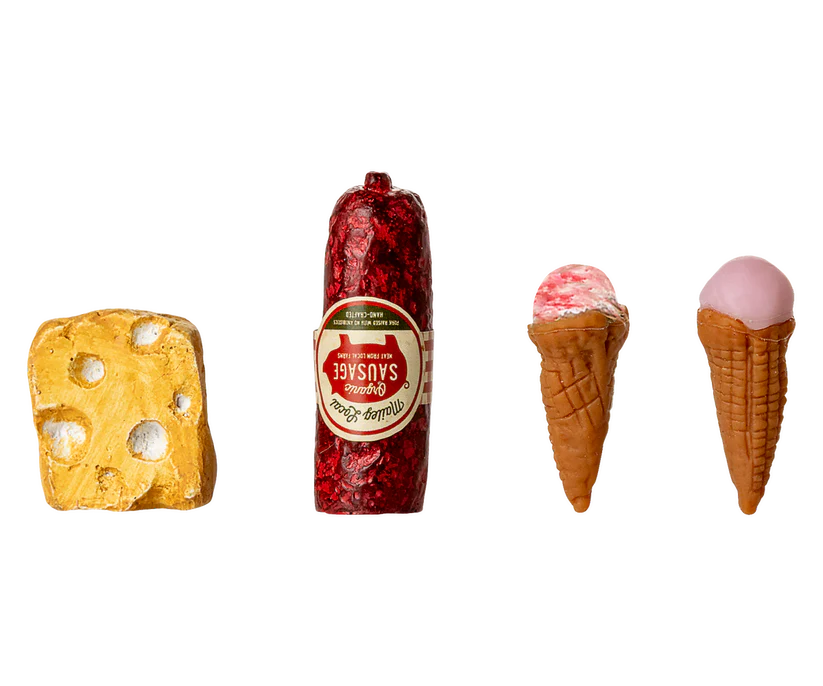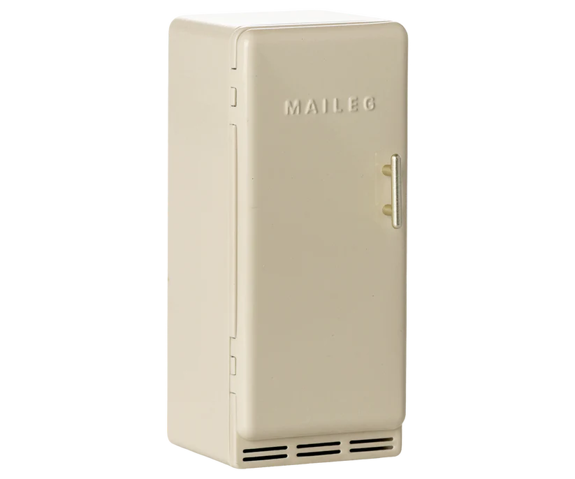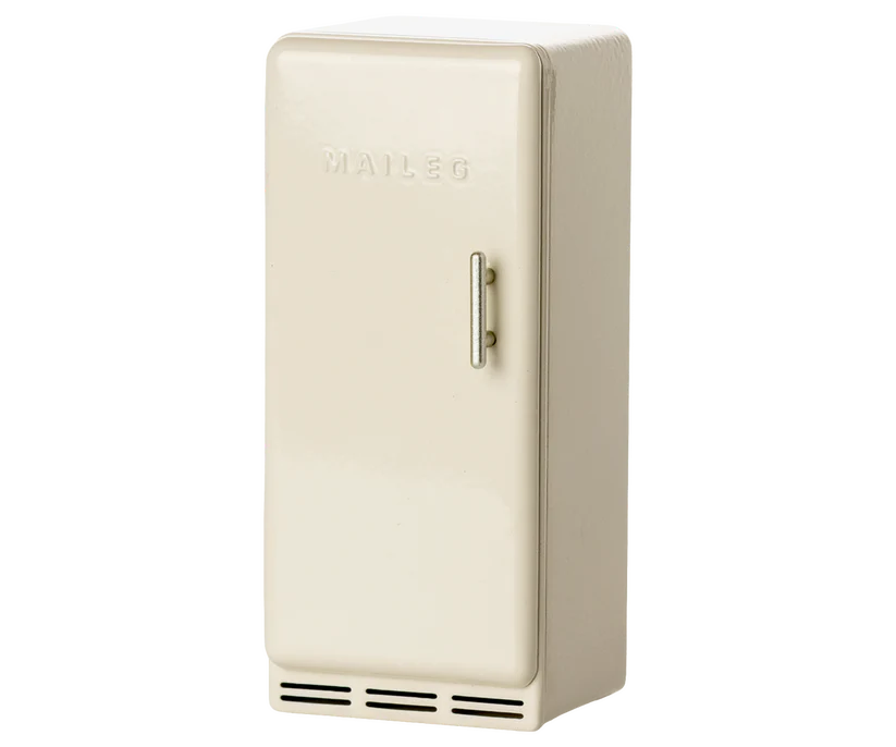 An old fashioned fridge that fits perfectly into the Maileg Mouse hole Farmhouse. Inside the fridge you will find a small cheese, sausage and some ice creams. These will extend the storytelling and play.