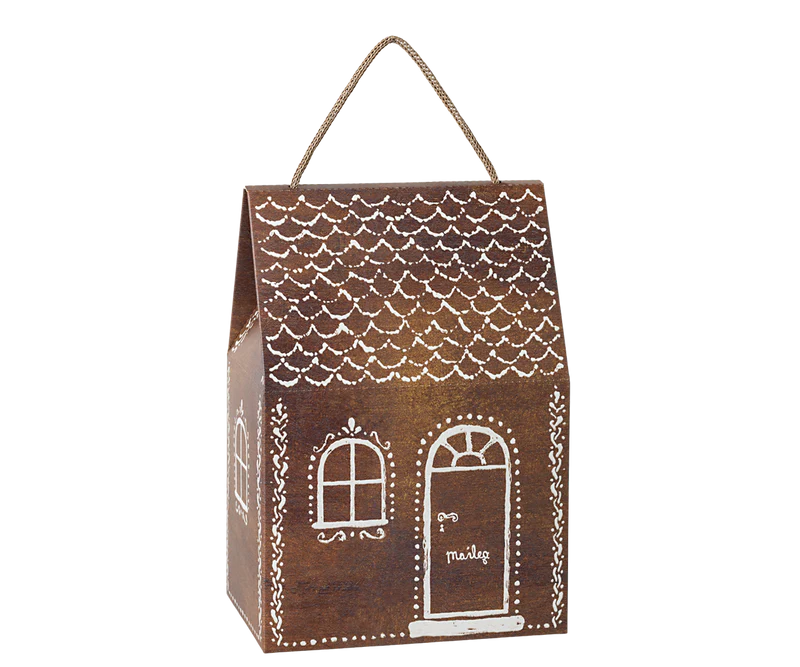 A paper bag shaped like a small gingerbread house. This is the perfect giftwrap for any small Maileg gift and will ensure the story will start before the gift is opened.