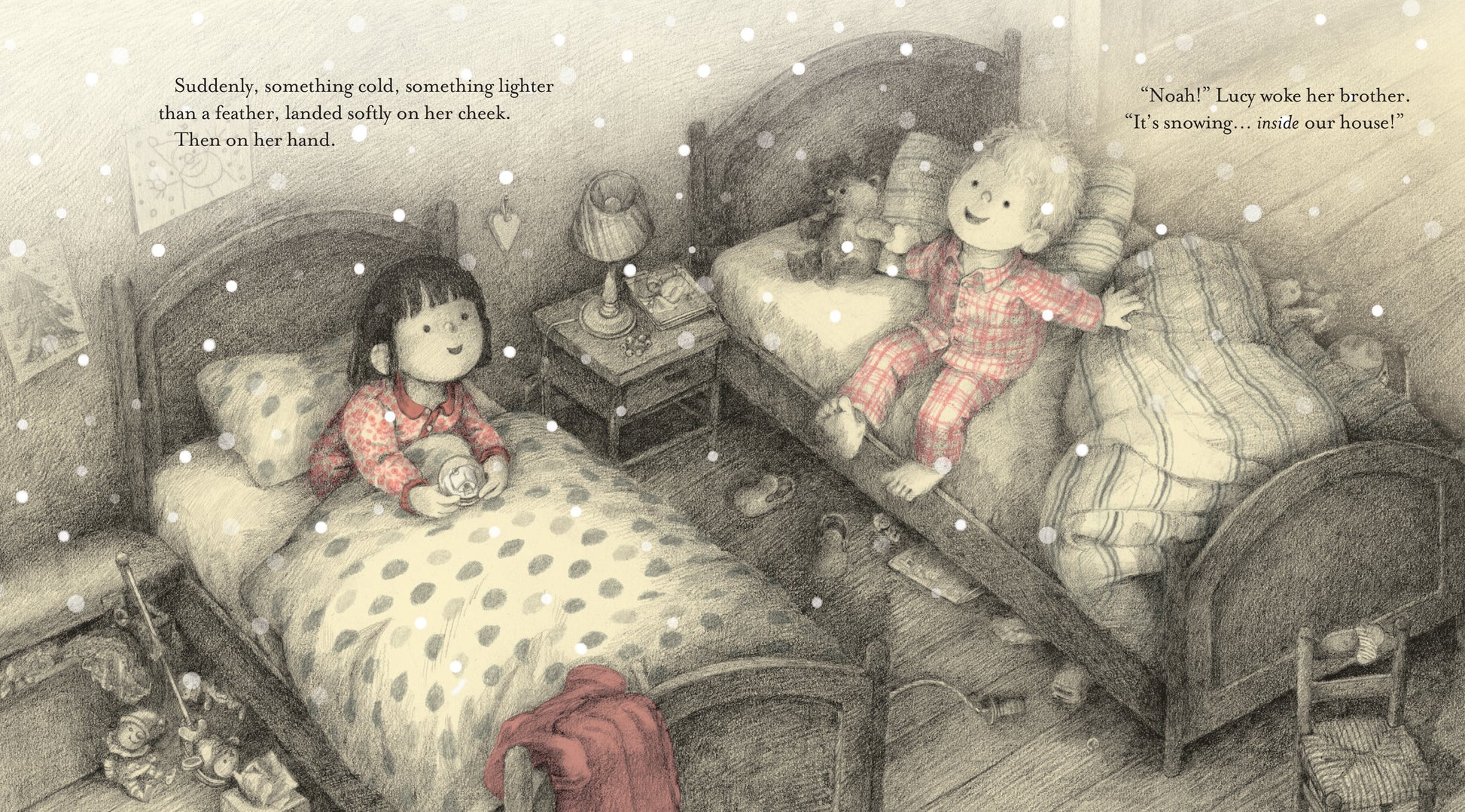 Lucy and Noah open a present on Christmas Eve. It's a beautiful snow globe, with a house inside that even looks like theirs, except they don't have any snow. Lucy lies awake looking at the snow globe, disappointed that it won't be a white Christmas. Suddenly, she feels something soft and cold land on her cheek. It can't really be snowing inside the house, can it?